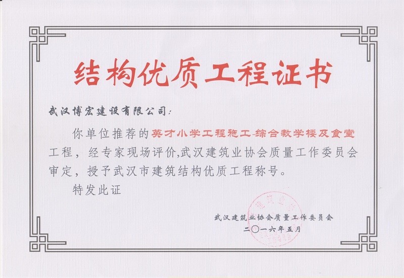 英才小學(xué)-綜合教學(xué)樓及食堂結(jié)構(gòu)優(yōu)質(zhì)工程證書(shū)