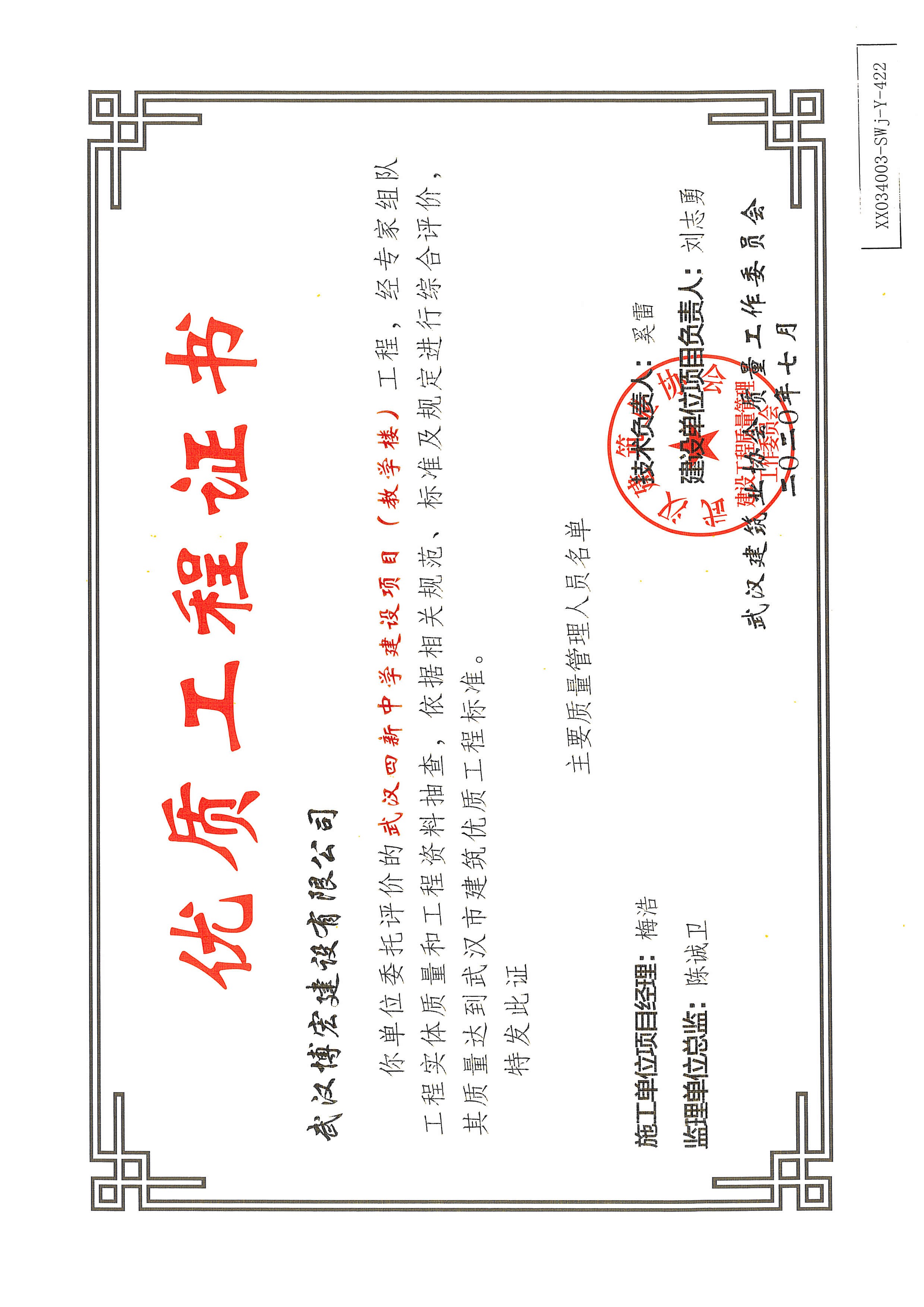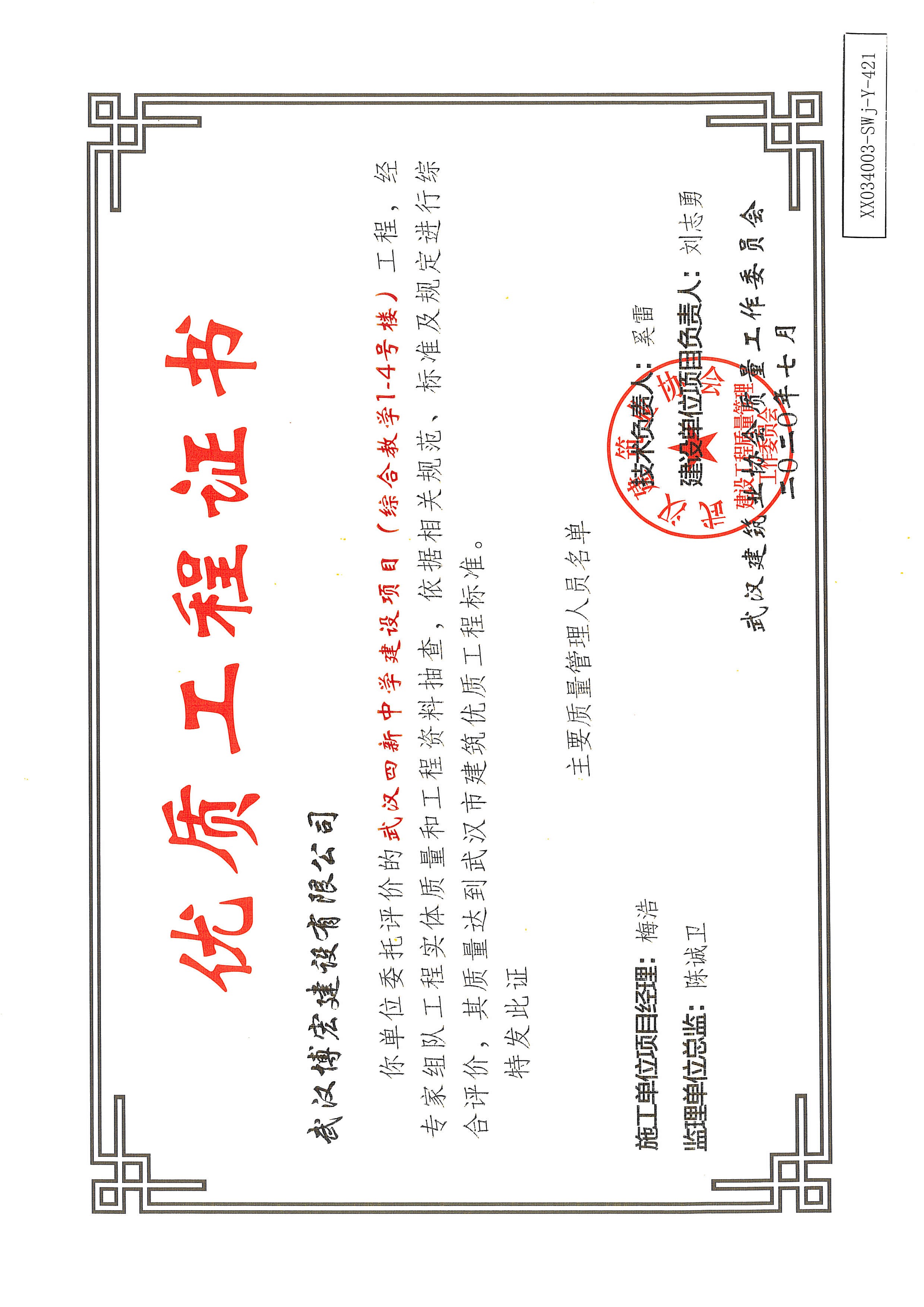 優(yōu)質(zhì)工程證書(shū)(武漢四新中學(xué)建設(shè)項(xiàng)目工程(綜合教學(xué)1--4號(hào)樓)